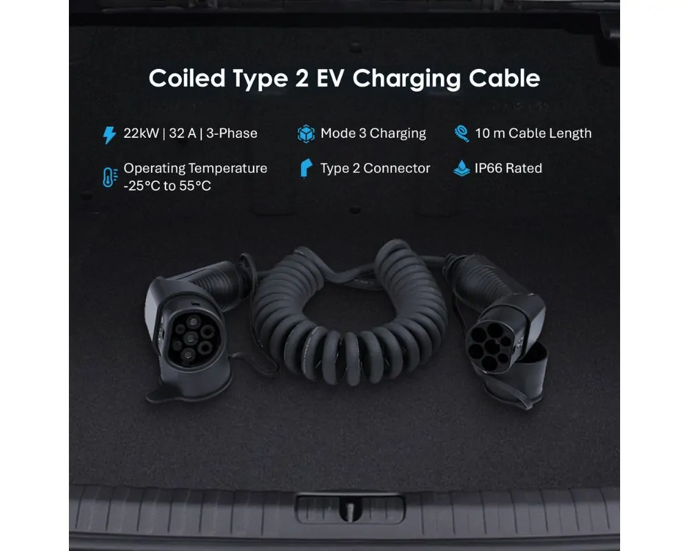 Coiled Type 2 to Type 2 EV Charging Cable | 10 Meters | 22kW