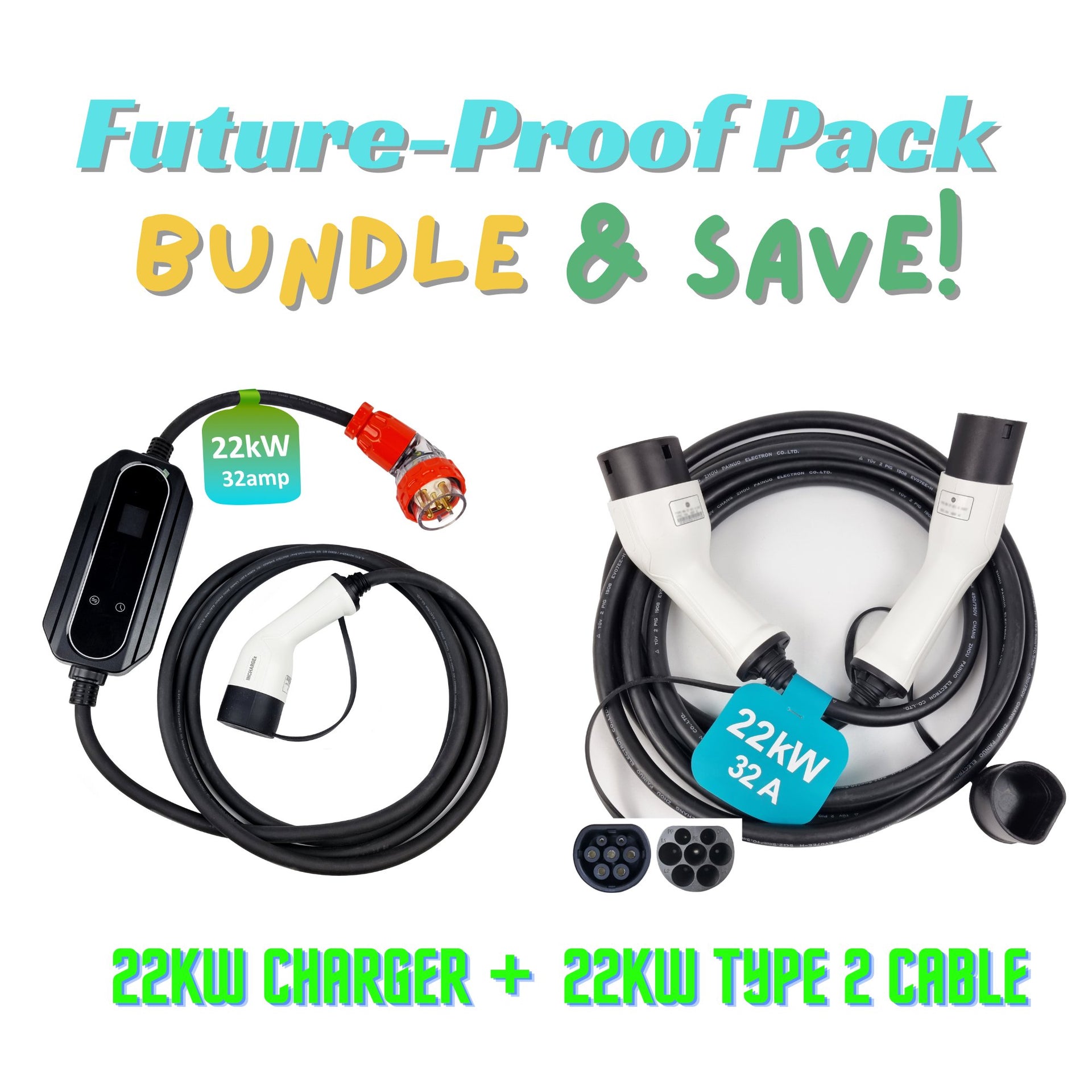 INCHARGEx FutureProof Pack 22kW 5 pin 32A 3 Phase EV Portable Charger & 22kW Type 2 to Type 2 CableFor the Electric Vehicle Enthusiast Seeking the Best in Charging Versatility and PowerElevate your electric vehicle (EV) charging experience with the INCHARGEx FutureProof Pack Bundle. This premier package combines top-of-the-line products, ensuring you have the most comprehensive and versatile charging solutions for your EV needs, whether at home, the office, or on the go.Included Products:INCHARGEx Ultra Power 22kW Portable EV Charger (32 Amp, 5 Pin, 3 Phase to Type 2, Adjustable):✅ Maximum Power Delivery: Delivers up to 22kW on a 32A three-phase connection, providing fast and efficient charging for your EV.✅ Adjustable Current Settings: Choose from 10A, 16A, 20A, 24A, or 32A to tailor your charging needs.✅ Wide Compatibility: Suitable for multiple EV brands, including Tesla Model 3 and Tesla Model Y, BYD, MG EV.✅ Works with both single-phase and three-phase homes. Supplies 7kW power on single-phase and up to 22kW on three-phase circuits.✅ Built-in Safety Features: Includes built-in RCD Type B/TypeA+DC6mA for DC leakage protection, also protection against overcurrent, overvoltage, and overheating for secure charging.INCHARGEx Premium 22kW Type 2 to Type 2 Cable (32 Amp, 3 Phase, 480v):✅ High-Power Transfer: Offers a maximum power of 22kW at 32Amp across three phases with a voltage rating of 480v.✅ Universal Fit: Compatible with all electric vehicle brands featuring a Type 2 socket, including Tesla Model Y.✅ Versatile Charging Configurations: Supports multiple charging setups, from 3.6kW on a single-phase 16amp circuit to the full 22kW on a three-phase 32amp circuit.✅ Optimized for Tesla Owners: While the cable can handle more than 11kW, Tesla Model 3 and Tesla Model Y are limited to 11kW charging on a three-phase AC circuit due to the capped onboard charger​​.The INCHARGEx FutureProof Pack is meticulously curated for EV owners who demand the best in charging technology. It offers the flexibility to charge your EV efficiently in various current settings, ensuring that you’re always getting the max charge for your EVs.