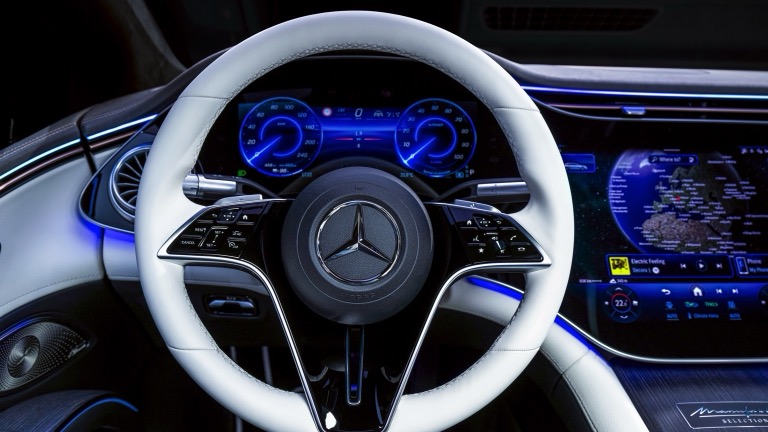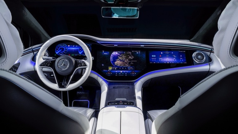 The EQS comes standard with a stunning interior, with the centrepiece being the optional “Hyperscreen”—a massive, curved glass panel that houses three separate screens, stretching across the entire dashboard. The car also features advanced technology like rear-axle steering for enhanced maneuverability and a comprehensive suite of advanced driver-assistance systems.